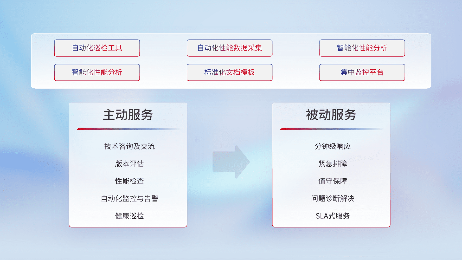 智能化工具和标准化文档,,,保障服务质量,,提供主动服务(包含技术咨询、、、版本评估、、、性能检查、、、自动化监控与告警、、、健康巡检)和被动服务包含(分钟级响应、、紧急排障、、值守保障、、问题诊断解决、、SLA服务)。。。